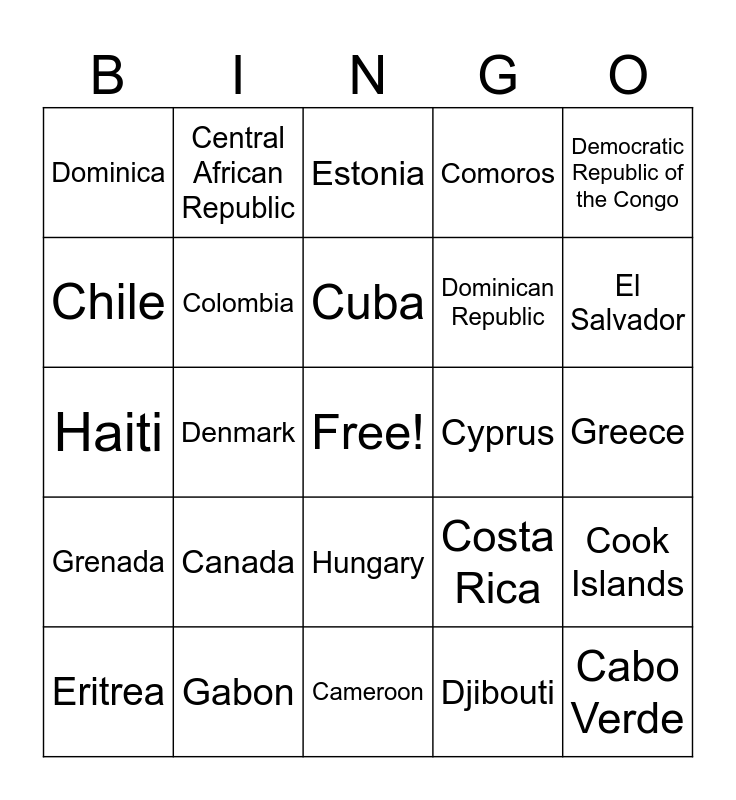 This bingo card has a free space and 51 words: Burundi, Cabo Verde, Cambodia, Cameroon, Canada, The Cayman Islands, Central African Republic, Chad, Chile, China, Colombia, Comoros, Cook Islands, Costa Rica, Cote d’Ivoire (Ivory Coast), Croatia, Cuba, Cyprus, Czechia, Democratic Republic of the Congo, Denmark, Djibouti, Dominica, Dominican Republic, Ecuador, Egypt, El Salvador, Equatorial Guinea, Eritrea, Estonia, Eswatini, Ethiopia, Fiji, Finland, France, Gabon, Gambia, Georgia, Germany, Ghana, Greece, Grenada, Guatemala, Guinea, Guinea-Bissau, Guyana, Haiti, Holy See (Vatican City), Honduras, Hungary and Iceland.