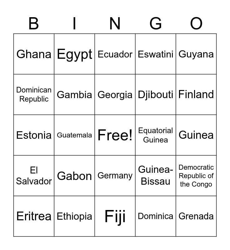 This bingo card has a free space and 28 words: Democratic Republic of the Congo, Denmark, Djibouti, Dominica, Dominican Republic, Ecuador, Egypt, El Salvador, Equatorial Guinea, Eritrea, Estonia, Eswatini, Ethiopia, Fiji, Finland, France, Gabon, Gambia, Georgia, Germany, Ghana, Greece, Grenada, Guatemala, Guinea, Guinea-Bissau, Guyana and Haiti.