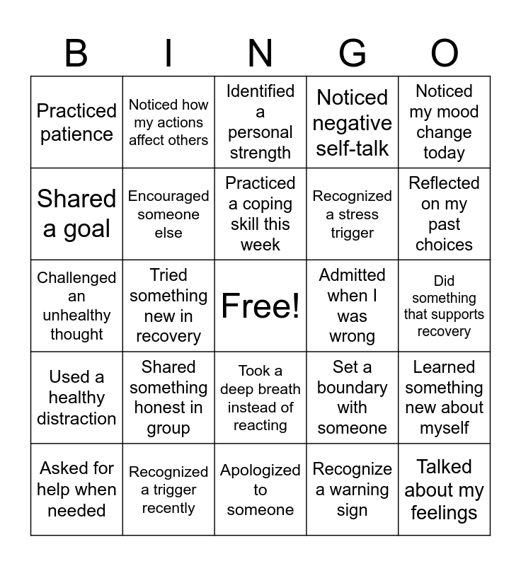 This bingo card has a free space and 24 words: Shared something honest in group, Recognized a trigger recently, Practiced a coping skill this week, Asked for help when needed, Noticed my mood change today, Practiced patience, Shared a goal, Noticed how my actions affect others, Admitted when I was wrong, Took a deep breath instead of reacting, Recognized a stress trigger, Challenged an unhealthy thought, Set a boundary with someone, Learned something new about myself, Encouraged someone else, Recognize a warning sign, Did something that supports recovery, Identified a personal strength, Reflected on my past choices, Tried something new in recovery, Talked about my feelings, Used a healthy distraction, Noticed negative self-talk and Apologized to someone.