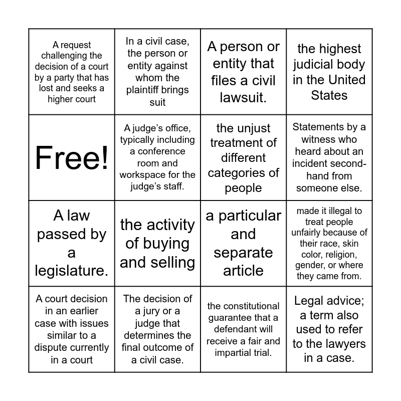 This bingo card has 16 words: The decision of a jury or a judge that determines the final outcome of a civil case., made it illegal to treat people unfairly because of their race, skin color, religion, gender, or where they came from., A person or entity that files a civil lawsuit., A request challenging the decision of a court by a party that has lost and seeks a higher court, A law passed by a legislature., In a civil case, the person or entity against whom the plaintiff brings suit, a particular and separate article, the constitutional guarantee that a defendant will receive a fair and impartial trial., Free!, A judge’s office, typically including a conference room and workspace for the judge’s staff., A court decision in an earlier case with issues similar to a dispute currently in a court, the highest judicial body in the United States, the activity of buying and selling, Statements by a witness who heard about an incident second-hand from someone else., the unjust treatment of different categories of people and Legal advice; a term also used to refer to the lawyers in a case..
