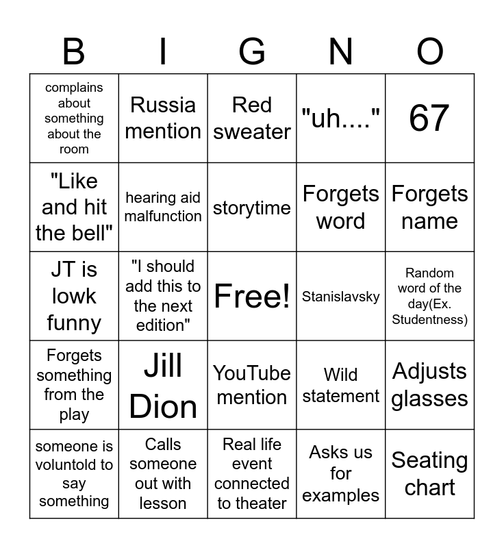 This bingo card has a free space and 24 words: Jill Dion, Calls someone out with lesson, storytime, someone is voluntold to say something, 67, complains about something about the room, "Like and hit the bell", Russia mention, Stanislavsky, YouTube mention, Forgets word, JT is lowk funny, Wild statement, Adjusts glasses, hearing aid malfunction, Asks us for examples, Random word of the day(Ex. Studentness), Red sweater, Forgets name, "I should add this to the next edition", Seating chart, Forgets something from the play, "uh...." and Real life event connected to theater.