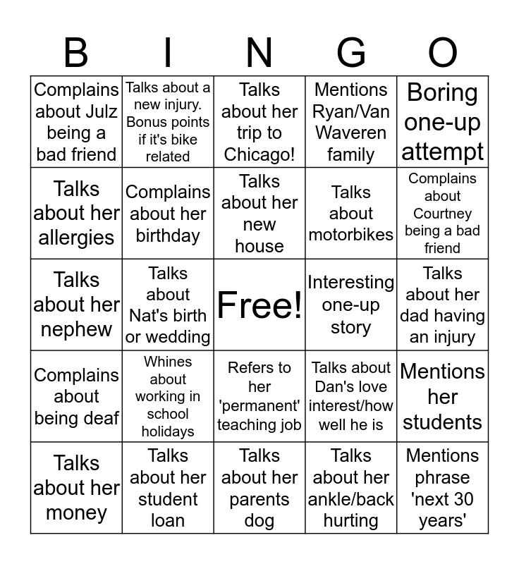 This bingo card has a free space and 24 words: Whines about working in school holidays, Talks about her student loan, Talks about her new house, Talks about her money, Boring one-up attempt, Complains about Julz being a bad friend, Talks about her allergies, Talks about a new injury. Bonus points if it's bike related, Interesting one-up story, Refers to her 'permanent' teaching job, Talks about motorbikes, Talks about her nephew, Talks about Dan's love interest/how well he is, Mentions her students, Complains about her birthday, Talks about her ankle/back hurting, Talks about her dad having an injury, Talks about her trip to Chicago!, Complains about Courtney being a bad friend, Talks about Nat's birth or wedding, Mentions phrase 'next 30 years', Complains about being deaf, Mentions Ryan/Van Waveren family and Talks about her parents dog.