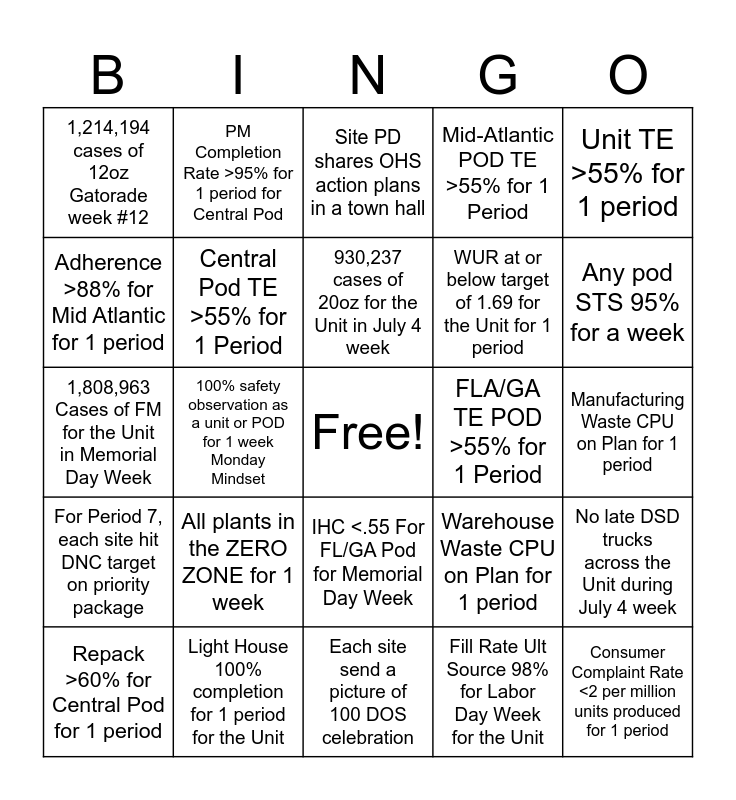 This bingo card has a free space and 24 words: All plants in the ZERO ZONE for 1 week, Light House 100% completion for 1 period for the Unit, 930,237 cases of 20oz for the Unit in July 4 week, Repack >60% for Central Pod for 1 period, Unit TE >55% for 1 period, 1,214,194 cases of 12oz Gatorade week #12, Adherence >88% for Mid Atlantic for 1 period, PM Completion Rate >95% for 1 period for Central Pod, FLA/GA TE POD >55% for 1 Period, IHC <.55 For FL/GA Pod for Memorial Day Week, WUR at or below target of 1.69 for the Unit for 1 period, 1,808,963 Cases of FM for the Unit in Memorial Day Week, Warehouse Waste CPU on Plan for 1 period, No late DSD trucks across the Unit during July 4 week, Central Pod TE >55% for 1 Period, Fill Rate Ult Source 98% for Labor Day Week for the Unit, Manufacturing Waste CPU on Plan for 1 period, Site PD shares OHS action plans in a town hall, Any pod STS 95% for a week, 100% safety observation as a unit or POD for 1 week Monday Mindset, Consumer Complaint Rate <2 per million units produced for 1 period, For Period 7, each site hit DNC target on priority package, Mid-Atlantic POD TE >55% for 1 Period and Each site send a picture of 100 DOS celebration.