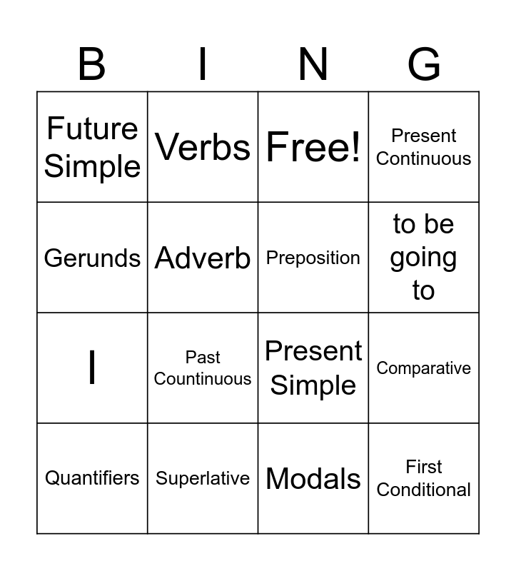This bingo card has 22 words: Superlative, Past Simple, Verbs, Zero Conditional, Adverb, Preposition, Future Simple, Free!, Present Simple, First Conditional, l, Present Continuous, Object Pronouns, Personal Pronouns, Modals, Question Words, Comparative, Quantifiers, Past Countinuous, Gerunds, to be going to and Apostrophe.