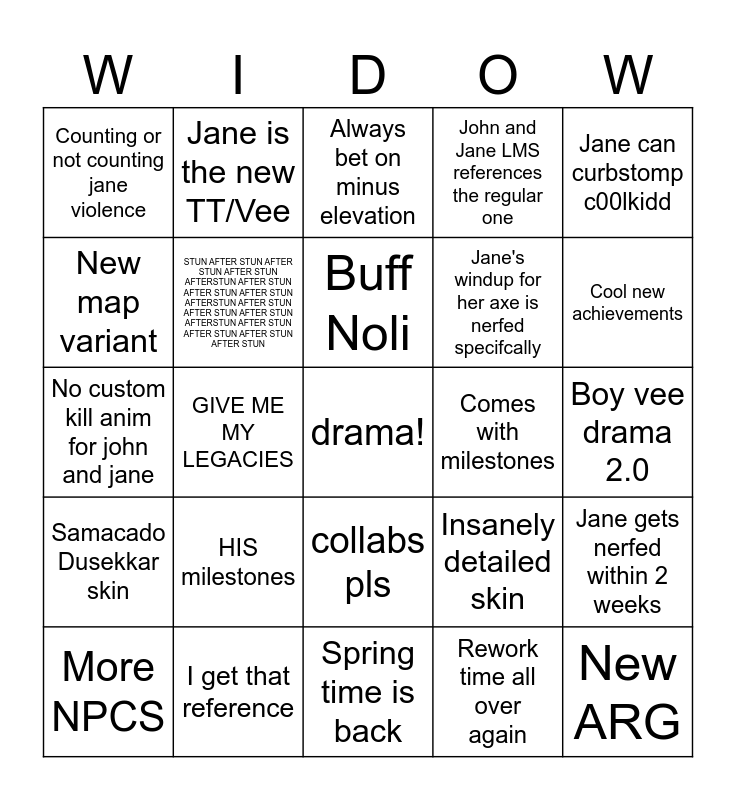 This bingo card has a free space and 24 words: HIS milestones, I get that reference, Buff Noli, More NPCS, Jane can curbstomp c00lkidd, Counting or not counting jane violence, New map variant, Jane is the new TT/Vee, Comes with milestones, collabs pls, Jane's windup for her axe is nerfed specifcally, No custom kill anim for john and jane, Insanely detailed skin, Jane gets nerfed within 2 weeks, STUN AFTER STUN AFTER STUN AFTER STUN AFTERSTUN AFTER STUN AFTER STUN AFTER STUN AFTERSTUN AFTER STUN AFTER STUN AFTER STUN AFTERSTUN AFTER STUN AFTER STUN AFTER STUN AFTER STUN, Rework time all over again, Boy vee drama 2.0, Always bet on minus elevation, Cool new achievements, GIVE ME MY LEGACIES, New ARG, Samacado Dusekkar skin, John and Jane LMS references the regular one and Spring time is back.