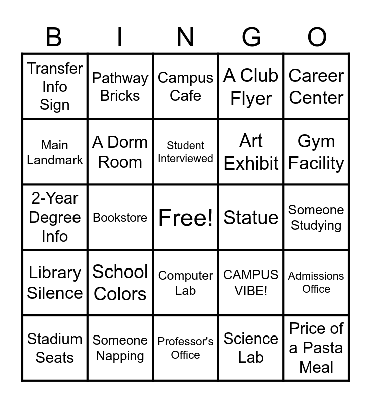 This bingo card has a free space and 24 words: Stadium Seats, School Colors, Student Interviewed, Science Lab, Career Center, Transfer Info Sign, Pathway Bricks, Campus Cafe, Statue, Someone Studying, 2-Year Degree Info, A Dorm Room, CAMPUS VIBE!, Admissions Office, Main Landmark, Someone Napping, Professor's Office, A Club Flyer, Gym Facility, Library Silence, Bookstore, Computer Lab, Art Exhibit and Price of a Pasta Meal.