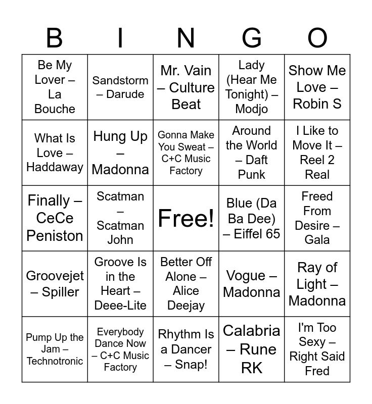 This bingo card has a free space and 25 words: Groove Is in the Heart – Deee-Lite, Rhythm Is a Dancer – Snap!, Gonna Make You Sweat – C+C Music Factory, Pump Up the Jam – Technotronic, Show Me Love – Robin S, Be My Lover – La Bouche, What Is Love – Haddaway, Sandstorm – Darude, Blue (Da Ba Dee) – Eiffel 65, Better Off Alone – Alice Deejay, Around the World – Daft Punk, Finally – CeCe Peniston, Vogue – Madonna, Ray of Light – Madonna, Hung Up – Madonna, Music Sounds Better With You – Stardust, Freed From Desire – Gala, Mr. Vain – Culture Beat, I Like to Move It – Reel 2 Real, Scatman – Scatman John, I'm Too Sexy – Right Said Fred, Everybody Dance Now – C+C Music Factory, Groovejet – Spiller, Lady (Hear Me Tonight) – Modjo and Calabria – Rune RK.