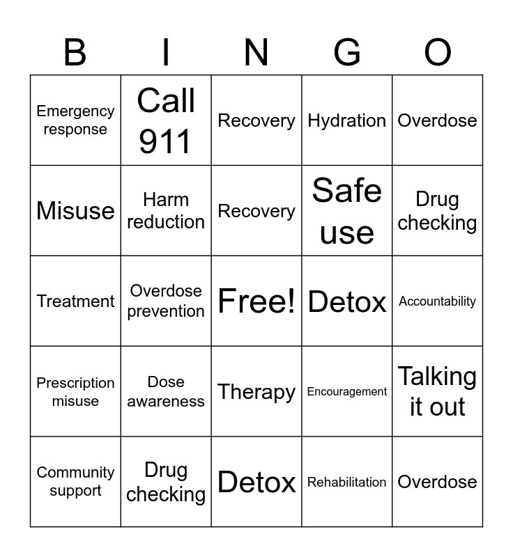 This bingo card has a free space and 101 words: Addiction, Dependence, Overdose, Withdrawal, Craving, Tolerance, Peer pressure, Substance use, Misuse, Relapse, Blackout, Fentanyl, Opioids, Stimulants, Vaping, Alcohol poisoning, Prescription misuse, Harm reduction, Naloxone, Narcan, Test strips, Fentanyl test, Safe use, Never use alone, Overdose prevention, Drug checking, Hydration, Dose awareness, Trusted friend, Emergency response, Call 911, Recovery, Treatment, Counseling, Support group, Therapy, Sponsor, Sober, Rehabilitation, Detox, Accountability, Community support, Healing, Addiction, Dependence, Overdose, Withdrawal, Craving, Tolerance, Peer pressure, Substance use, Misuse, Relapse, Blackout, Fentanyl, Opioids, Stimulants, Vaping, Alcohol poisoning, Prescription misuse, Harm reduction, Naloxone, Narcan, Test strips, Fentanyl test, Safe use, Never use alone, Overdose prevention, Drug checking, Hydration, Dose awareness, Trusted friend, Emergency response, Call 911, Recovery, Treatment, Counseling, Support group, Therapy, Sponsor, Sober, Rehabilitation, Detox, Accountability, Community support, Healing, Accountability, Mentor, Safe friends, Family support, Encouragement, Healthy coping, Mindfulness, Exercise, Journaling, Talking it out, Community, Role model, Goal planning, Self-care and Positive mindset.