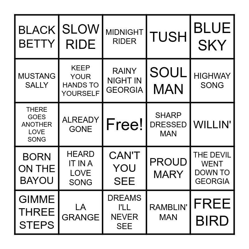 This bingo card has a free space and 45 words: SWEET HOME ALABAMA, FREE BIRD, SIMPLE MAN, GIMME THREE STEPS, TUESDAY'S GONE, RAMBLIN' MAN, MIDNIGHT RIDER, JESSICA, BLUE SKY, LA GRANGE, TUSH, SHARP DRESSED MAN, CAN'T YOU SEE, HEARD IT IN A LOVE SONG, FLIRTIN' WITH DISASTER, DREAMS I'LL NEVER SEE, GREEN GRASS AND HIGH TIDES, THERE GOES ANOTHER LOVE SONG, TRAIN, TRAIN, HIGHWAY SONG, SLOW RIDE, FOOL FOR THE CITY, MISSISSIPPI QUEEN, BLACK BETTY, DIXIE CHICKEN, WILLIN', CALL ME THE BREEZE, COCAINE, PROUD MARY, BORN ON THE BAYOU, GREEN RIVER, THE DEVIL WENT DOWN TO GEORGIA, LONG HAIRED COUNTRY BOY, FOLSOM PRISON BLUES, TAKE IT EASY, ALREADY GONE, COPPERHEAD ROAD, DRIFT AWAY, POLK SALAD ANNIE, RAINY NIGHT IN GEORGIA, MUSTANG SALLY, SOUL MAN, WHEN A MAN LEOVES A WOMAN, KEEP YOUR HANDS TO YOURSELF and RUNNIN' DOWN A DREAM.