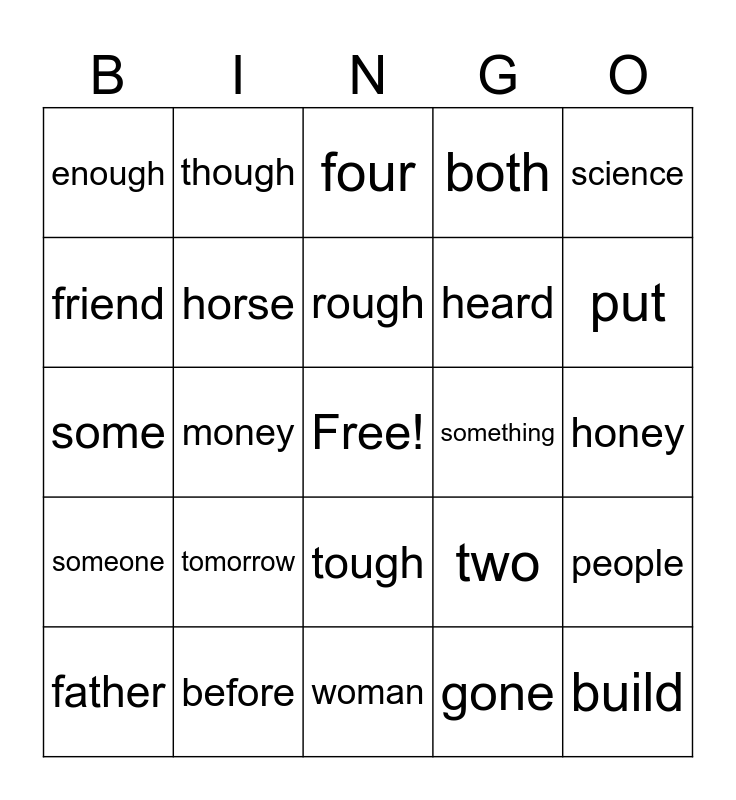 This bingo card has a free space and 28 words: people, guess, heard, gone, friend, four, though, someone, something, father, some, both, before, woman, put, our, tomorrow, horse, rough, tough, enough, ocean, build, money, honey, two, science and half.