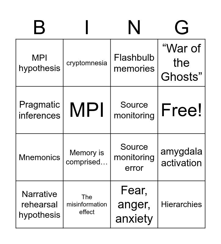 This bingo card has 17 words: Fear, anger, anxiety, Narrative rehearsal hypothesis, Flashbulb memories, MPI hypothesis, Memory is comprised…, “War of the Ghosts”, amygdala activation, Source monitoring, Free!, MPI, The misinformation effect, Source monitoring error, Pragmatic inferences, cryptomnesia, Mnemonics, Chunking and Hierarchies.