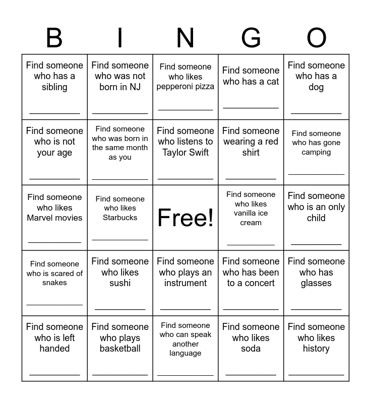 This bingo card has a free space and 24 words: Find someone who likes sushi __________, Find someone who plays basketball ___________, Find someone who listens to Taylor Swift ___________, Find someone who is left handed __________, Find someone who has a dog __________, Find someone who has a sibling __________, Find someone who is not your age __________, Find someone who was not born in NJ ___________, Find someone who likes vanilla ice cream ___________, Find someone who plays an instrument __________, Find someone wearing a red shirt __________, Find someone who likes Marvel movies ___________, Find someone who has been to a concert ___________, Find someone who has glasses __________, Find someone who was born in the same month as you _____________, Find someone who likes soda __________, Find someone who is an only child __________, Find someone who likes pepperoni pizza ____________, Find someone who has gone camping _____________, Find someone who likes Starbucks _____________, Find someone who likes history ___________, Find someone who is scared of snakes _____________, Find someone who has a cat ___________ and Find someone who can speak another language _____________.