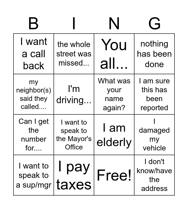 This bingo card has 16 words: I want to speak to a sup/mgr, I pay taxes, You all..., nothing has been done, my neighbor(s) said they called...., the whole street was missed..., I am elderly, I damaged my vehicle, I want a call back, I'm driving..., Free!, I am sure this has been reported, Can I get the number for...., I want to speak to the Mayor's Office, What was your name again? and I don't know/have the address.