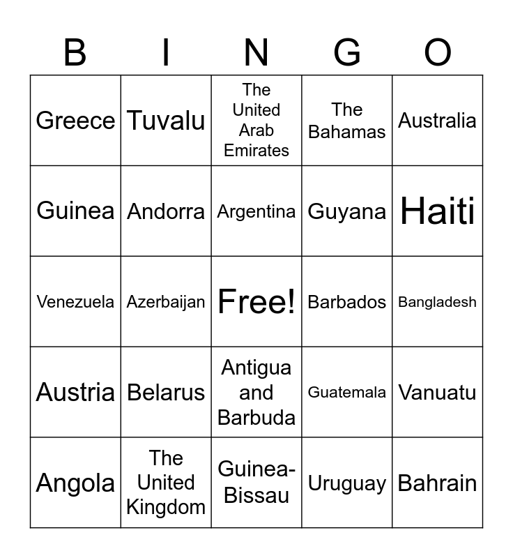 This bingo card has a free space and 39 words: Afghanistan, Albania, Algeria, Andorra, Angola, Antigua and Barbuda, Argentina, Armenia, Australia, Austria, Azerbaijan, The Bahamas, Bahrain, Bangladesh, Barbados, Belarus, Belgium, Greece, Grenada, Guatemala, Guinea, Guinea-Bissau, Guyana, Haiti, Tonga, Trinidad and Tobago, Tunisia, Turkey, Turkmenistan, Tuvalu, Uganda, Ukraine, The United Arab Emirates, The United Kingdom, Uruguay, Uzbekistan, Vanuatu, Venezuela and Vietnam.