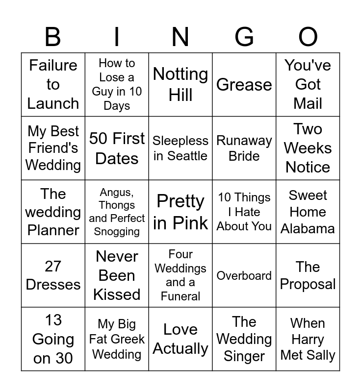 This bingo card has 32 words: The Wedding Singer, Bridget Jones' Diary, Angus, Thongs and Perfect Snogging, Dirty Dancing, 27 Dresses, 50 First Dates, You've Got Mail, The Proposal, How to Lose a Guy in 10 Days, When Harry Met Sally, Sleepless in Seattle, Notting Hill, Pretty Woman, Forgetting Sarah Marshall, 10 Things I Hate About You, Music and Lyrics, 13 Going on 30, The wedding Planner, Four Weddings and a Funeral, Never Been Kissed, Overboard, The Princess Bride, Sweet Home Alabama, My Big Fat Greek Wedding, Pretty in Pink, Grease, Runaway Bride, My Best Friend's Wedding, Failure to Launch, Love Actually, Maid in Manhattan and Two Weeks Notice.