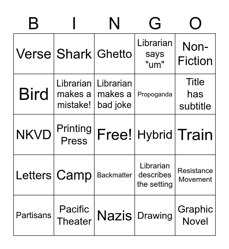This bingo card has a free space and 24 words: Camp, Pacific Theater, Librarian makes a bad joke, Partisans, Non-Fiction, Verse, Bird, Shark, Hybrid, Backmatter, Propoganda, NKVD, Librarian describes the setting, Resistance Movement, Librarian makes a mistake!, Drawing, Train, Ghetto, Title has subtitle, Printing Press, Graphic Novel, Letters, Librarian says "um" and Nazis.