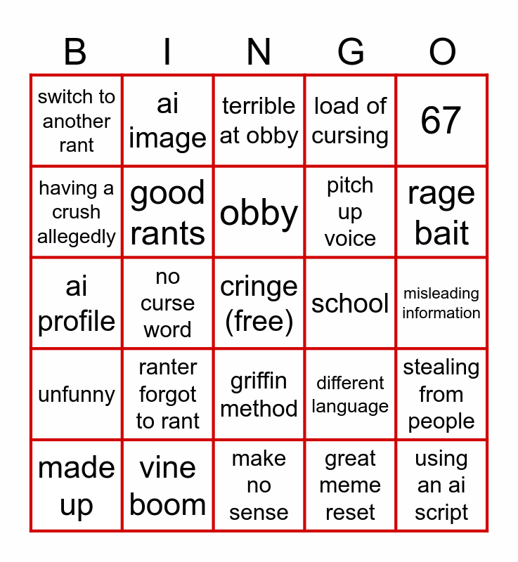 This bingo card has a free space and 29 words: made up, anxious sound effect, no curse word, i predict what they gonna said, switch to another rant, terrible at obby, good rants, ranter forgot to rant, school, vine boom, misleading information, using an ai script, make no sense, great meme reset, rage bait, unvalid point, griffin method, unfunny, 67, ai profile, different language, valid point, pitch up voice, having a crush allegedly, load of cursing, ai image, stealing from people, obby and slime.