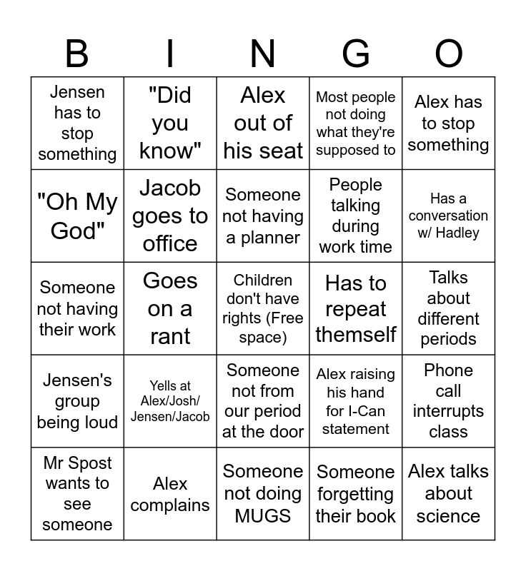 This bingo card has a free space and 25 words: Yells at Alex/Josh/ Jensen/Jacob, Someone not doing MUGS, Someone not having a planner, Mr Spost wants to see someone, Alex has to stop something, Jensen has to stop something, "Oh My God", "Did you know", Has to repeat themself, Someone not from our period at the door, People talking during work time, Someone not having their work, Alex raising his hand for I-Can statement, Phone call interrupts class, Jacob goes to office, I am an adult and you are a child, Talks about different periods, Alex out of his seat, Has a conversation w/ Hadley, Goes on a rant, Alex talks about science, Alex complains, Jensen's group being loud, Most people not doing what they're supposed to and Someone forgetting their book.