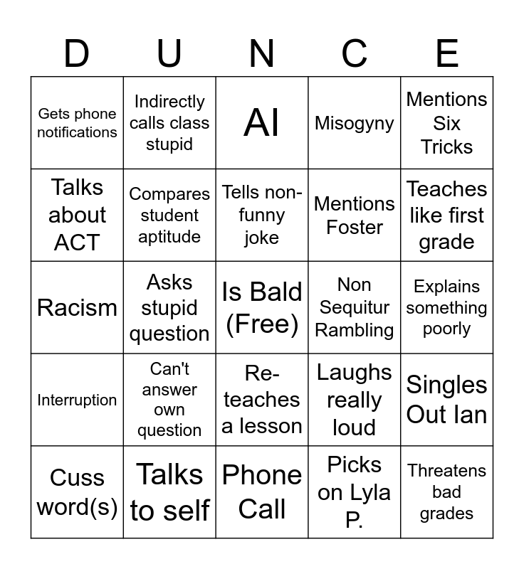 This bingo card has a free space and 24 words: Can't answer own question, Talks to self, Tells non-funny joke, Cuss word(s), Mentions Six Tricks, Gets phone notifications, Talks about ACT, Indirectly calls class stupid, Non Sequitur Rambling, Re-teaches a lesson, Mentions Foster, Racism, Laughs really loud, Singles Out Ian, Compares student aptitude, Picks on Lyla P., Explains something poorly, AI, Teaches like first grade, Asks stupid question, Threatens bad grades, Interruption, Misogyny and Phone Call.
