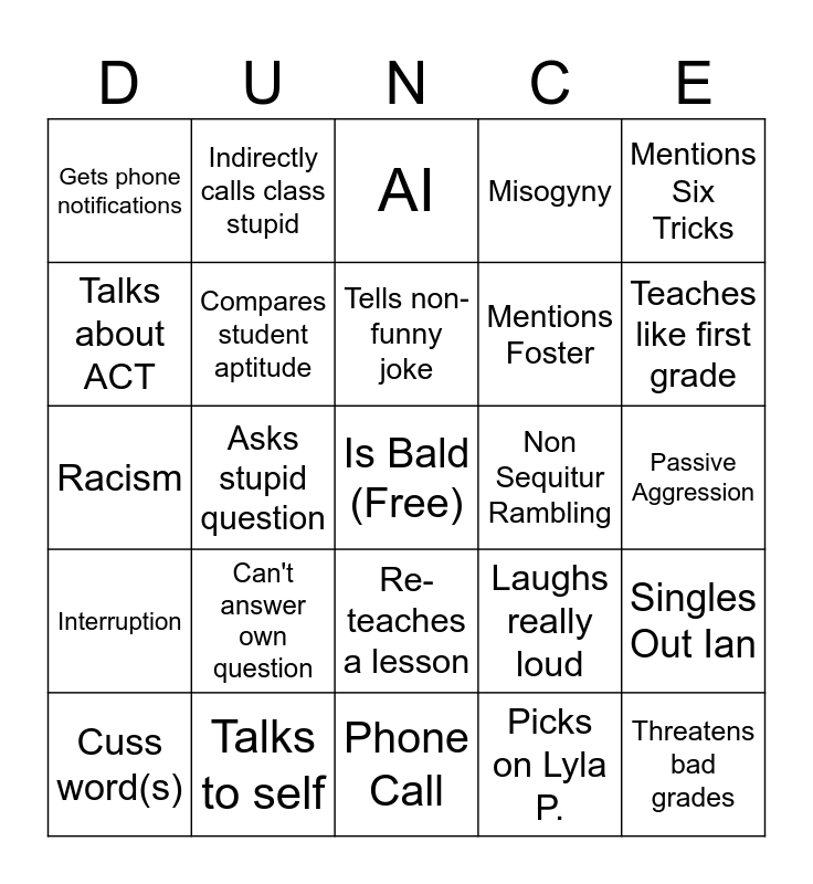 This bingo card has a free space and 24 words: Can't answer own question, Talks to self, Tells non-funny joke, Cuss word(s), Mentions Six Tricks, Gets phone notifications, Talks about ACT, Indirectly calls class stupid, Non Sequitur Rambling, Re-teaches a lesson, Mentions Foster, Racism, Laughs really loud, Singles Out Ian, Compares student aptitude, Picks on Lyla P., Passive Aggression, AI, Teaches like first grade, Asks stupid question, Threatens bad grades, Interruption, Misogyny and Phone Call.