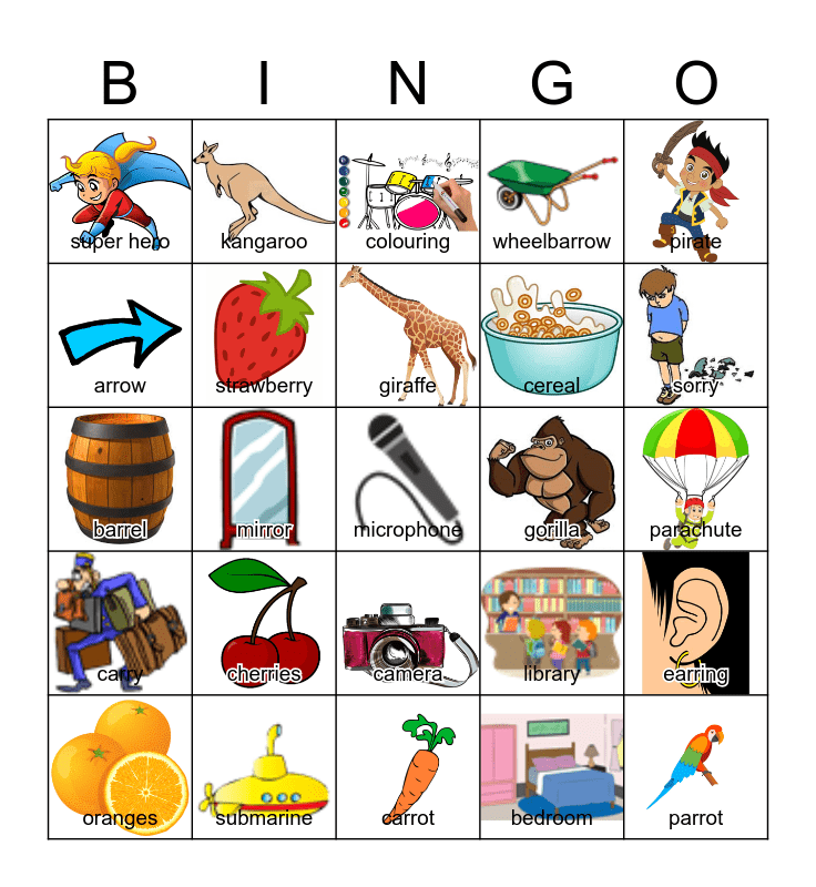 This bingo card has 25 images and 25 words: cherries, carrot, giraffe, oranges, pirate, super hero, arrow, kangaroo, gorilla, camera, cereal, barrel, library, earring, strawberry, parrot, parachute, colouring, sorry, mirror, microphone, submarine, carry, wheelbarrow and bedroom.