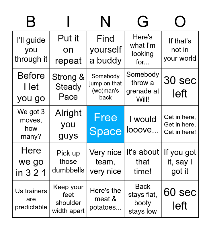 This bingo card has a free space and 49 words: Last and Final round, Here's what's happening..., It's not about speed, Back stays flat, booty stays low, Get in here, Get in here, Get in here!, Let's take advantage of it, Put it on repeat, If you got one, say "I got one", Somebody throw a grenade at Will!, Don't you dare cut it short, Before I let you go, Alright you guys, It's about that time!, 60 sec left, The concept stays the same, The next 60 seconds are yours, Find yourself a buddy, I would looove..., Keep the eyes up, keep the chest up, I'll guide you through it, Keep your feet shoulder width apart, Here's the meat & potatoes..., Here's what I'm looking for..., If that's not in your world, That's my 1, that's my 2, Pick up those dumbbells, Somebody jump on that (wo)man's back, Piece of Cake, If you got it, say I got it, Here we go in 3 2 1, Tell'em you still look fresh, Very nice team, very nice, Hands in, Hands in, Relaxing 3 2 1, Us trainers are predictable, High 5 your buddy, You've got a minute & a half left, If you got in a good workout say "oh yeah", 30 sec left, This right here is gonna be my 1, Get your mind right, Over-exaggerate..., Hard Count, Bring it in close, bring it in tight, We got 3 moves, how many?, Strong & Steady Pace, Sense of urgency, Easy Count and High 5 at least 3 people.