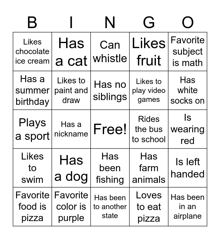 This bingo card has a free space and 24 words: Has a dog, Favorite color is purple, Has no siblings, Favorite food is pizza, Favorite subject is math, Likes chocolate ice cream, Has a summer birthday, Has a cat, Rides the bus to school, Has been fishing, Likes to play video games, Plays a sport, Has farm animals, Is left handed, Likes to paint and draw, Loves to eat pizza, Is wearing red, Can whistle, Has white socks on, Has a nickname, Has been in an airplane, Likes to swim, Likes fruit and Has been to another state.