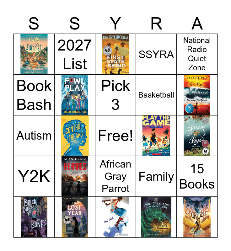 This bingo card has 15 images, a free space and 14 words: WWII, African Gray Parrot, Y2K, National Radio Quiet Zone, Autism, Family, Friends, Basketball, Book Bash, SSYRA, 2027 List, 15 Books, Pick 3 and Read them all!.