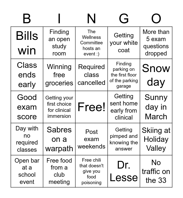 This bingo card has a free space and 26 words: Post exam weekends, Dr. Lesse, Required class cancelled, Free food from a club meeting, More than 5 exam questions dropped, Bills win, Class ends early, Finding an open study room, Sunny day in March, Getting pimped and knowing the answer, Finding parking on the first floor of the parking garage, Good exam score, Skiing at Holiday Valley, Open bar at a school event, Getting your first choice for clinical immersion, No line at Penny's, Getting your white coat, Day with no required classes, The Wellness Committee hosts an event :), No traffic on the 33, Snow day, Free chili that doesn't give you food poisoning, Getting sent home early from clinical, Sabres on a warpath, Winning free groceries and Getting called 'Doctor'.