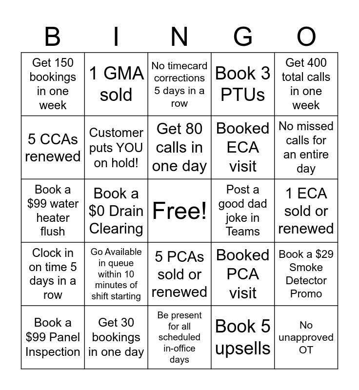 This bingo card has a free space and 26 words: 5 PCAs sold or renewed, Book 5 upsells, Get 80 calls in one day, Get 30 bookings in one day, Get 400 total calls in one week, Get 150 bookings in one week, 5 CCAs renewed, 1 GMA sold, 1 ECA sold or renewed, Booked PCA visit, Booked ECA visit, Book a $99 water heater flush, Book a $29 Smoke Detector Promo, Book a $99 Panel Inspection, Book a $0 Drain Clearing, 2 *new* CCAs, Book 3 PTUs, Clock in on time 5 days in a row, No timecard corrections 5 days in a row, No unapproved OT, No missed calls for an entire day, Be present for all scheduled in-office days, Post a good dad joke in Teams, Go Available in queue within 10 minutes of shift starting, Customer puts YOU on hold! and Resolve a customer's concern.