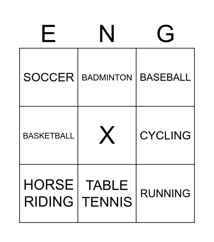 This bingo card has a free space and 12 words: TENNIS, HOCKEY, RUNNING, CYCLING, BADMINTON, BASEBALL, TABLE TENNIS, SURFING, SOCCER, BASKETBALL, HORSE RIDING and ICE SKATING.