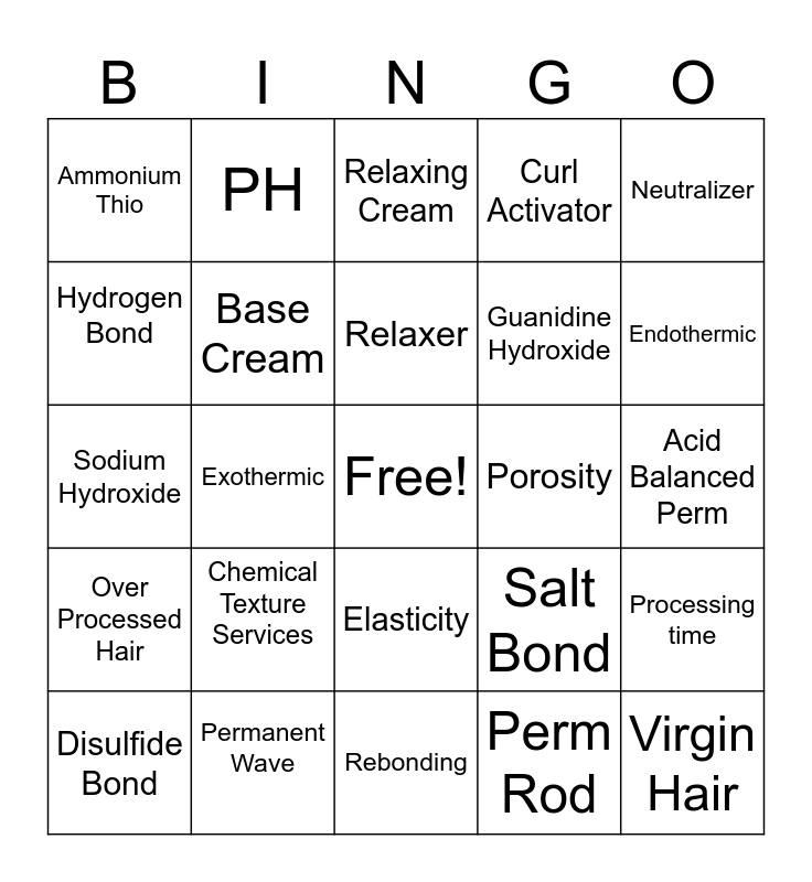 This bingo card has a free space and 24 words: Chemical Texture Services, Permanent Wave, Relaxer, Disulfide Bond, Neutralizer, Ammonium Thio, Hydrogen Bond, PH, Porosity, Elasticity, Guanidine Hydroxide, Sodium Hydroxide, Salt Bond, Processing time, Base Cream, Perm Rod, Acid Balanced Perm, Relaxing Cream, Endothermic, Exothermic, Virgin Hair, Over Processed Hair, Curl Activator and Rebonding.