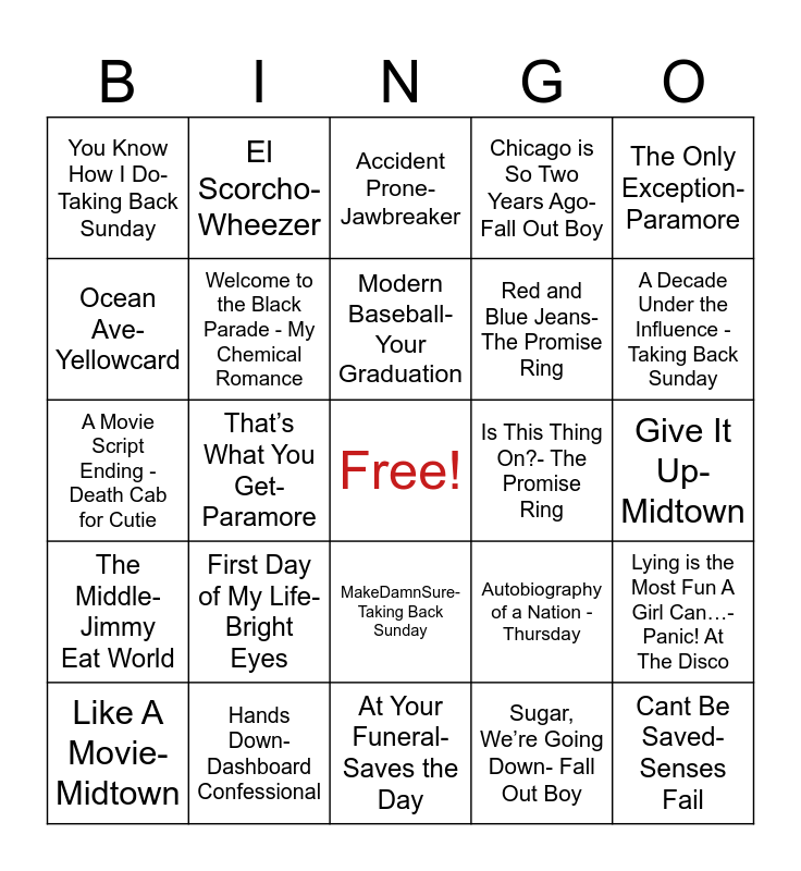 This bingo card has a free space and 34 words: Revolution-The Used, Sugar, We’re Going Down- Fall Out Boy, Jersey Shore- The Promise Ring, Two Is Better Than One- BOYS LIKE GIRLS, The Middle- Jimmy Eat World, Welcome to the Black Parade - My Chemical Romance, The Only Exception- Paramore, Like A Movie- Midtown, El Scorcho- Wheezer, Turnpike Divides -Thursday, Modern Baseball- Your Graduation, Accident Prone- Jawbreaker, Seven- Sunny Day Real Estate, Helena - My Chemical Romance, Is This Thing On?- The Promise Ring, A Decade Under the Influence -Taking Back Sunday, Hands Down- Dashboard Confessional, A Movie Script Ending -Death Cab for Cutie, First Day of My Life- Bright Eyes, Autobiography of a Nation -Thursday, MakeDamnSure- Taking Back Sunday, Face Down- The Red Jumpsuit Apparatus, You Know How I Do- Taking Back Sunday, Give It Up- Midtown, At Your Funeral- Saves the Day, Cant Be Saved- Senses Fail, Chicago is So Two Years Ago- Fall Out Boy, Shoulder to the Wheel- Saves the Day, Red and Blue Jeans- The Promise Ring, Ocean Ave- Yellowcard, The Great Escape- BOYS LIKE GIRLS, That’s What You Get- Paramore, Lying is the Most Fun A Girl Can…- Panic! At The Disco and Pink Triangle- Wheezer.
