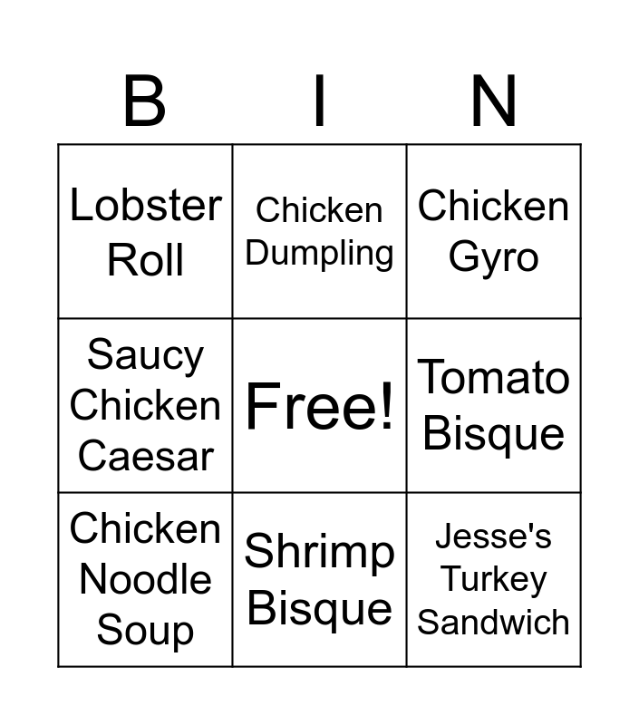 This bingo card has a free space and 10 words: Shrimp Bisque, Chicken Gyro, Lobster Roll, Jesse's Turkey Sandwich, Saucy Chicken Caesar, Chicken Noodle Soup, Chicken Dumpling, Tomato Bisque, Tomato Bisque and Chicken Wild Rice Soup.