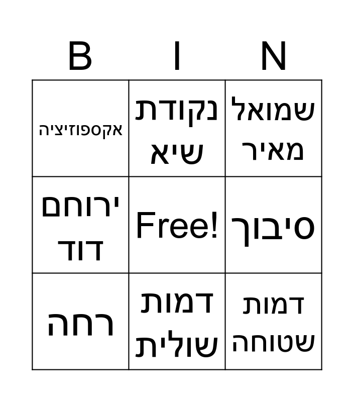 This bingo card has a free space and 23 words: דמות ראשית, דמות משנה, דמות שולית, דמות עגולה, דמות שטוחה, אקספוזיציה, סיבוך, נקודת שיא, סיום סגור, סיום פתוח, מספר עד, מוטיב, פראדל, אברהם נוח, חיים רפאל, שרה לאה, שמואל מאיר, איסר לוין, רחה, חנה, ירוחם דוד, גיטל and זאוויל אלקהס.