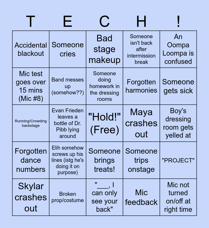 This bingo card has a free space and 24 words: Elih somehow screws up his lines (istg he's doing it on purpose), Broken prop/costume, Someone doing homework in the dressing rooms, Skylar crashes out, An Oompa Loompa is confused, Accidental blackout, Mic test goes over 15 mins (Mic #8), Someone cries, Maya crashes out, Someone brings treats!, Forgotten harmonies, Running/Crowding backstage, Someone trips onstage, "PROJECT", Band messes up (somehow??), Mic feedback, Boy's dressing room gets yelled at, Bad stage makeup, Someone gets sick, Evan Frieden leaves a bottle of Dr. Pibb lying around, Mic not turned on/off at right time, Forgotten dance numbers, Someone isn't back after intermission break and "___, I can only see your back".