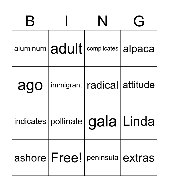This bingo card has 28 words: adapted, abandons, indicates, eliminates, immigrant, complicates, adult, extras, Free!, bandanna, gala, alpaca, scuba, parades, pollinate, domino, primitive, radical, attitude, capital, aluminum, aware, ashore, Linda, peninsula, China, ago and alive.