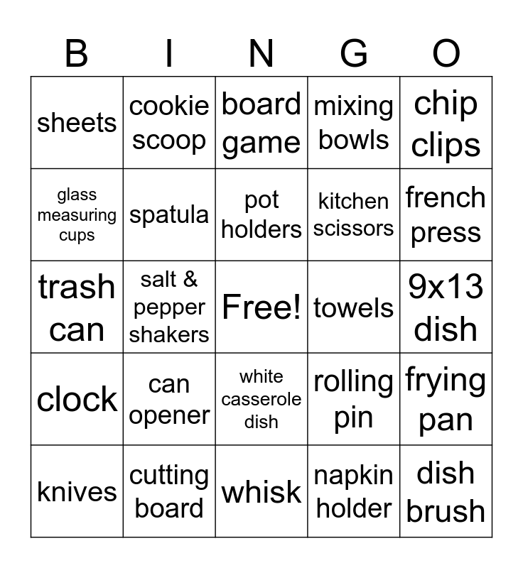 This bingo card has a free space and 27 words: rolling pin, waffle maker, kitchen scissors, whisk, glass measuring cups, board game, cookie scoop, clock, towels, frying pan, trash can, mixing bowls, knives, cutting board, french press, peeler, spatula, pot holders, can opener, sheets, 9x13 dish, napkin holder, salt & pepper shakers, dish brush, white casserole dish, chip clips and food storage containers.