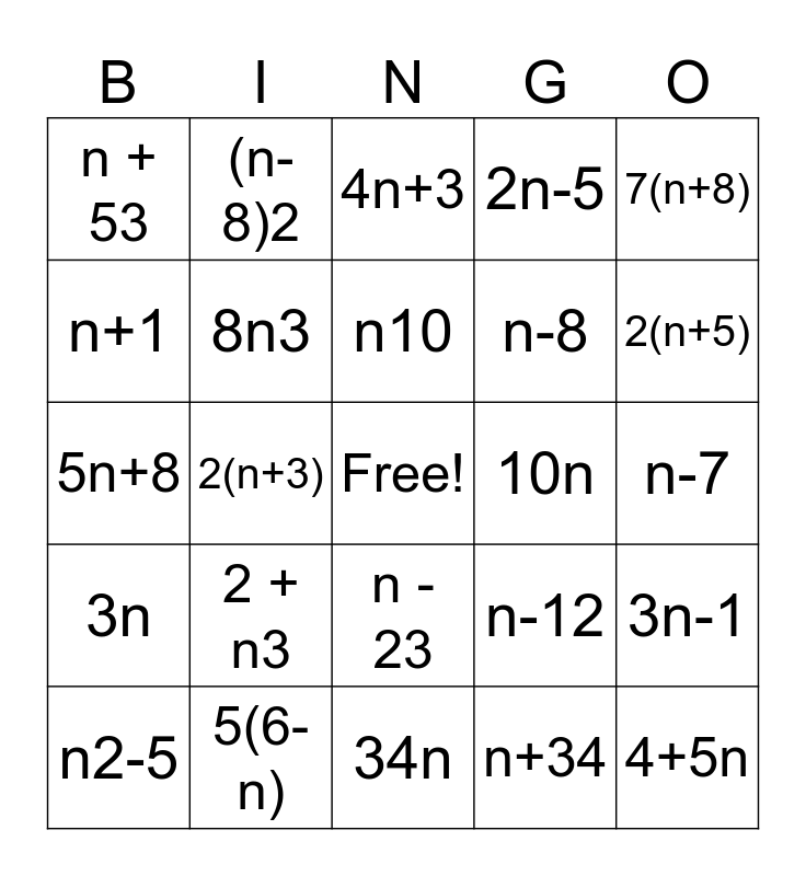 This bingo card has a free space and 30 words: 5(6-n), 15-3n, 2(n+3), 4(2+n), n + 53, 4n+3, 8n3, n - 23, 10n, 34n, n-7, 4+5n, n+34, n2-2, 2(n+5), 6(n+9), n-12, 3n, 2 + n3, 7(n+8), 5n+8, 2n-6, (n-8)2, n-8, n+1, 2n-5, 3n-1, n2-5, n10 and 3+n.