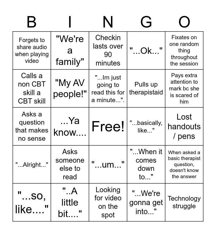 This bingo card has a free space and 27 words: "...When it comes down to...", Mispronounces a basic word, Pulls up therapistaid, Looking for video on the spot, Calls a non CBT skill a CBT skill, Checkin lasts over 90 minutes, "We're a family", "...Alright...", "...basically, like...", When asked a basic therapist question, doesn't know the answer, Asks a question that makes no sense, "...Ok...", "...so, like....", "..A little bit....", Pays extra attention to mark bc she is scared of him, "What are you eating?", "My AV people!", "...Im just going to read this for a minute..."., Asks someone else to read, Forgets to share audio when playing video, Lost handouts / pens, "...We're gonna get into...", ...Ya know...., Technology struggle, "...um...", Fixates on one random thing throughout the session and Confuses herself.