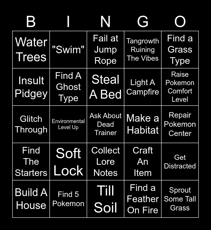 This bingo card has a free space and 24 words: Soft Lock, Find 5 Pokemon, Steal A Bed, Build A House, Find a Grass Type, Water Trees, Insult Pidgey, "Swim", Make a Habitat, Collect Lore Notes, Light A Campfire, Glitch Through, Craft An Item, Get Distracted, Find A Ghost Type, Find a Feather On Fire, Repair Pokemon Center, Fail at Jump Rope, Raise Pokemon Comfort Level, Environmental Level Up, Sprout Some Tall Grass, Find The Starters, Tangrowth Ruining The Vibes and Till Soil.