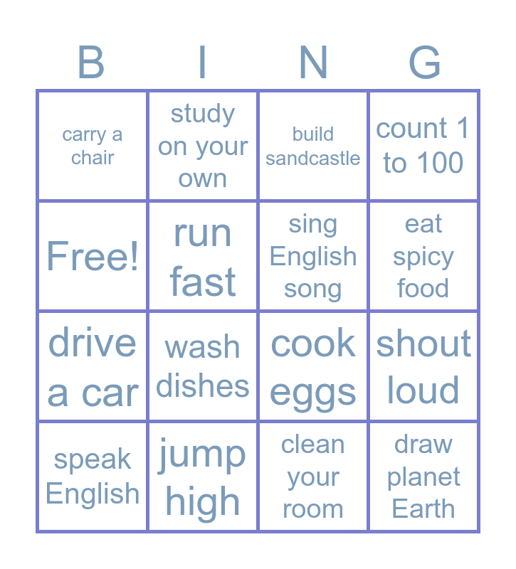 This bingo card has 16 words: jump high, shout loud, build sandcastle, carry a chair, drive a car, study on your own, cook eggs, clean your room, Free!, run fast, speak English, count 1 to 100, wash dishes, eat spicy food, sing English song and draw planet Earth.