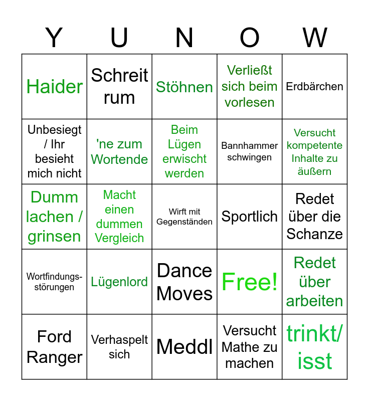 This bingo card has 25 words: Lügenlord, Meddl, Beim Lügen erwischt werden, Ford Ranger, Erdbärchen, Haider, Unbesiegt / Ihr besieht mich nicht, Schreit rum, Sportlich, Dance Moves, Bannhammer schwingen, Dumm lachen / grinsen, Free!, Redet über arbeiten, 'ne zum Wortende, trinkt/ isst, Redet über die Schanze, Stöhnen, Versucht kompetente Inhalte zu äußern, Macht einen dummen Vergleich, Wirft mit Gegenständen, Verhaspelt sich, Wortfindungs- störungen, Verließt sich beim vorlesen and Versucht Mathe zu machen.