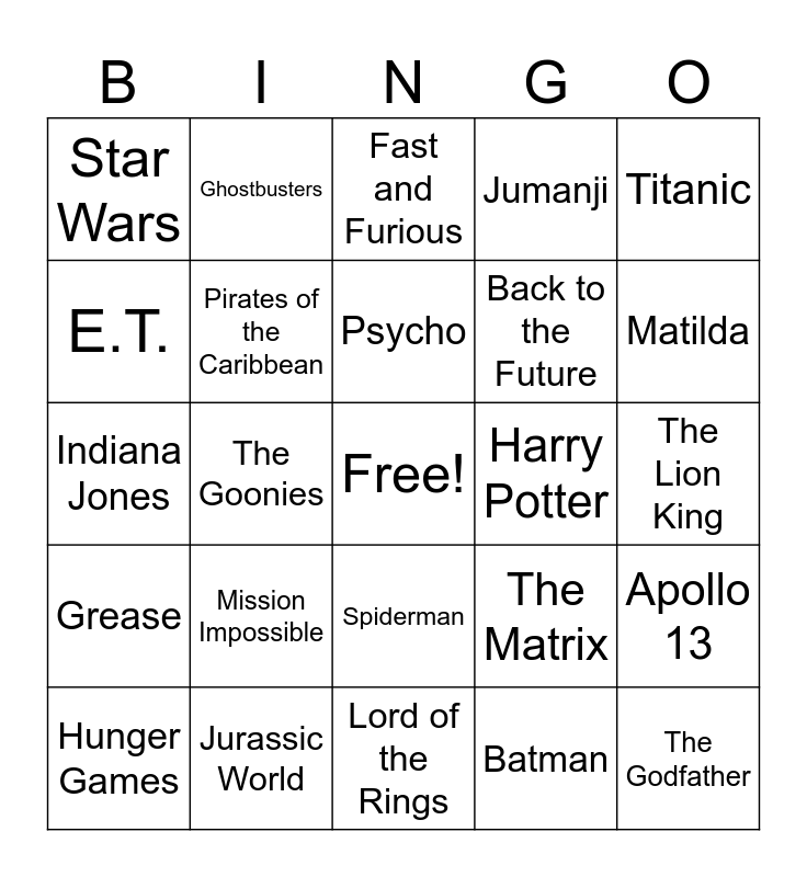 This bingo card has a free space and 28 words: Apollo 13, Avengers, Back to the Future, Batman, E.T., Fast and Furious, Ghostbusters, Grease, Harry Potter, Hunger Games, Indiana Jones, Jumanji, Jurassic World, Lord of the Rings, Matilda, Minions, Mission Impossible, Pirates of the Caribbean, Psycho, Spiderman, Star Wars, Terminator, The Godfather, The Goonies, The Lion King, The Matrix, Titanic and Toy Story.