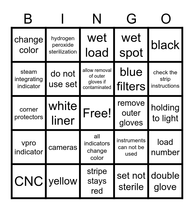 This bingo card has a free space and 60 words: aesculap lid, yellow, holes, vpro indicator, set not sterile, blue area, do not use set, set sterile, blue filters, hold up to light, wet spot, set went through sterilization, steam integrating indicator, orange, sterilizer tape, change color, double glove, black, darker, allow removal of outer gloves if contaminated, remove outer gloves, wet load, CNC, load number, pull all containers from the load, another set, IUSS, color change, check the strip instructions, filter integrity, wet spots, sterility breach, aesculap container, indicator, hydrogen peroxide sterilization, pink liner, indicator results, white liner, blue, corner protectors, sterilization failure, cameras, holding to light, Davinci Scopes, instruments can not be used, verify sterilization indicators, non-sterile instruments, they are all pulled, expected color change, all indicators change color, stripe stays red, sterilization exposure, do not use the set, immediate use sterilization, indicator color change, internal indicator, green, sterile water, red and enzymatis solution.