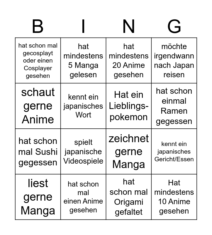 This bingo card has 16 words: hat schon mal einen Anime gesehen, kennt ein japanisches Gericht/Essen, hat mindestens 20 Anime gesehen, hat schon mal gecosplayt oder einen Cosplayer gesehen, hat schon mal Sushi gegessen, hat mindestens 5 Manga gelesen, zeichnet gerne Manga, hat schon mal Origami gefaltet, schaut gerne Anime, kennt ein japanisches Wort, liest gerne Manga, möchte irgendwann nach Japan reisen, spielt japanische Videospiele, hat schon einmal Ramen gegessen, Hat ein Lieblings-pokemon and Hat mindestens 10 Anime gesehen.