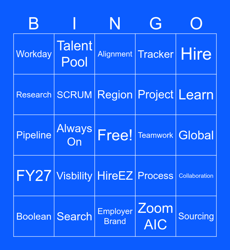 This bingo card has a free space and 40 words: Strategy, Pipeline, Partnership, SCRUM, Search, HireEZ, Region, Offer, Hire, FY27, Always On, Tracker, Sourcing, Global, Teamwork, Visbility, Tableau, Workday, LinkedIn, Alignment, Collaboration, Zoom AIC, Project, Research, HART, Engagement, Prompt, AI Review, Campaign, Talent Insights, SKO, Boolean, Sync, Process, Learn, Employer Brand, Immigration, Compliance, Talent Pool and Stakeholder.