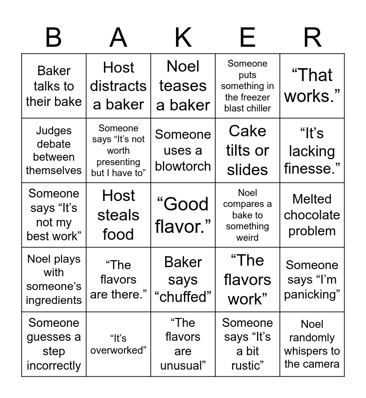 This bingo card has 146 words: Its all down to the Showstopper!, “Soggy bottom”, “Good crumb”, “Beautiful layers”, “It’s a bit stodgy”, “The flavors work”, “Absolutely delicious”, “A bit underbaked”, “Overproved”, “Lovely texture”, “Worth the calories”, “Good lamination”, “Quite messy”, “Very neat”, “Style over substance”, “I’m running out of time”, “I’ve never made this before”, Someone starts running in the tent, Someone drops a bake, Someone forgets an ingredient, Someone starts over, Someone says “I’m panicking”, Someone says “Just get it in the oven”, Someone cuts into something too early, Host makes a terrible pun, Host steals food, Host distracts a baker, Someone says “It’s hot in the tent”, Someone fans the oven, Dramatic judging music, Awkward host joke silence, Host mispronounces a bake, Collapsing cake, Melted chocolate problem, Decoration falls off, Filling leaks out, Something burns, Bake sticks to the mold, Cake tilts or slides, Piping bag explodes, Paul Hollywood handshake, Someone mentions their nan/grandmother, Baker says “chuffed”, Someone cries, Someone laughs from stress, Baker talks about family tradition, Someone says “it just needs to set”, Judges say “ambitious”, Everyone’s looks different, Someone says “I’ve never heard of this”, Someone reads instructions out loud, Judges say “we expected better”, Someone guesses a step incorrectly, Someone forgets a component, Noel imprints on a baker, Noel pretends to help but makes things worse, Noel comforts a stressed baker, Noel eats something mid-conversation, Noel squats or crouches next to a baker, Noel starts a bizarre tangent, Noel teases a baker, Noel randomly whispers to the camera, Noel asks a strange question, Noel tries to distract someone piping, Noel says something surreal, Noel compares a bake to something weird, Noel plays with someone’s ingredients, Noel imitates a baker, Baker says “I’m actually shaking”, Baker says “I’m gutted”, Baker says “I’m happy with that… I think”, Baker checks the oven every 10 seconds, Baker talks to their bake, Baker says “Please work”, Baker counts layers out loud, Baker fans chocolate to make it set, Baker says “I’m just going to go for it”, Baker says “That’ll have to do”, Chocolate melting in the heat, Someone puts something in the freezer blast chiller, Someone says “blast chiller”, Someone’s sugar work shatters, Someone uses acetate collar, Someone sprays edible glitter, Someone uses isomalt, Someone paints gold leaf, Someone attempts mirror glaze, “Worth the calories” (Prue), “That’s a triumph”, “The flavors are unusual”, “That’s quite delicate”, “You’ve been very ambitious”, “It looks fantastic”, “The bake is good, but…”, “It’s overworked”, “The layers are uneven”, Paul raises one eyebrow skeptically, Someone says “I’m proud of that”, Someone says “It’s not my best work”, A wobbling dessert, Judges cut something and pause dramatically, Judges debate between themselves, Baker explains flavors nervously, Judge says “It needed longer”, Someone’s showstopper breaks while moving it, Someone uses a blowtorch, Baker says “I just hope it tastes good”, The bake is good.”, “It’s underproved.”, “It’s a little dry.”, “That’s a shame.”, “The flavors are there.”, “It’s a bit clumsy.”, “It’s lacking finesse.”, “It’s very clever.”, “Good flavor.”, “That works.”, Host pretends to present a bake, Host asks what something tastes like before judging, Noel appears suddenly behind a baker, Noel makes a spooky or goth joke, Someone walks their bake to the front very carefully, Someone holds their breath during judging, Someone says “I’m happy with the flavors”, Someone says “It’s a bit rustic”, Baker apologizes before judging, Baker says “Sorry, chef” or apologizes to Paul, Someone finishes way earlier than everyone else, Someone still assembling when time is called, Judges laugh at a technical result, Someone misreads the recipe, Someone counts baking times out loud, Someone forgets to turn the oven on, Custard doesn’t set, Jelly won’t set, Cake sticks when turned out, Chocolate seizes, Something breaks during decoration, Baker cuts themselves and gets a plaster, Someone says “I just want to do my family proud”, Someone calls their bake “a disaster”, Someone says “It’s not worth presenting but I have to”, Someone says “I’m devastated”, Someone laughs while clearly panicking, Paul stares silently while chewing and Prue takes a huge bite.
