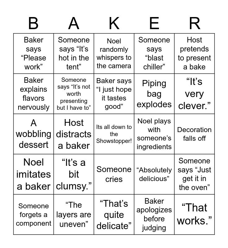 This bingo card has a free space and 145 words: “Soggy bottom”, “Good crumb”, “Beautiful layers”, “It’s a bit stodgy”, “The flavors work”, “Absolutely delicious”, “A bit underbaked”, “Overproved”, “Lovely texture”, “Worth the calories”, “Good lamination”, “Quite messy”, “Very neat”, “Style over substance”, “I’m running out of time”, “I’ve never made this before”, Someone starts running in the tent, Someone drops a bake, Someone forgets an ingredient, Someone starts over, Someone says “I’m panicking”, Someone says “Just get it in the oven”, Someone cuts into something too early, Host makes a terrible pun, Host steals food, Host distracts a baker, Someone says “It’s hot in the tent”, Someone fans the oven, Dramatic judging music, Awkward host joke silence, Host mispronounces a bake, Collapsing cake, Melted chocolate problem, Decoration falls off, Filling leaks out, Something burns, Bake sticks to the mold, Cake tilts or slides, Piping bag explodes, Paul Hollywood handshake, Someone mentions their nan/grandmother, Baker says “chuffed”, Someone cries, Someone laughs from stress, Baker talks about family tradition, Someone says “it just needs to set”, Judges say “ambitious”, Everyone’s looks different, Someone says “I’ve never heard of this”, Someone reads instructions out loud, Judges say “we expected better”, Someone guesses a step incorrectly, Someone forgets a component, Noel imprints on a baker, Noel pretends to help but makes things worse, Noel comforts a stressed baker, Noel eats something mid-conversation, Noel squats or crouches next to a baker, Noel starts a bizarre tangent, Noel teases a baker, Noel randomly whispers to the camera, Noel asks a strange question, Noel tries to distract someone piping, Noel says something surreal, Noel compares a bake to something weird, Noel plays with someone’s ingredients, Noel imitates a baker, Baker says “I’m actually shaking”, Baker says “I’m gutted”, Baker says “I’m happy with that… I think”, Baker checks the oven every 10 seconds, Baker talks to their bake, Baker says “Please work”, Baker counts layers out loud, Baker fans chocolate to make it set, Baker says “I’m just going to go for it”, Baker says “That’ll have to do”, Chocolate melting in the heat, Someone puts something in the freezer blast chiller, Someone says “blast chiller”, Someone’s sugar work shatters, Someone uses acetate collar, Someone sprays edible glitter, Someone uses isomalt, Someone paints gold leaf, Someone attempts mirror glaze, “Worth the calories” (Prue), “That’s a triumph”, “The flavors are unusual”, “That’s quite delicate”, “You’ve been very ambitious”, “It looks fantastic”, “The bake is good, but…”, “It’s overworked”, “The layers are uneven”, Paul raises one eyebrow skeptically, Someone says “I’m proud of that”, Someone says “It’s not my best work”, A wobbling dessert, Judges cut something and pause dramatically, Judges debate between themselves, Baker explains flavors nervously, Judge says “It needed longer”, Someone’s showstopper breaks while moving it, Someone uses a blowtorch, Baker says “I just hope it tastes good”, The bake is good.”, “It’s underproved.”, “It’s a little dry.”, “That’s a shame.”, “The flavors are there.”, “It’s a bit clumsy.”, “It’s lacking finesse.”, “It’s very clever.”, “Good flavor.”, “That works.”, Host pretends to present a bake, Host asks what something tastes like before judging, Noel appears suddenly behind a baker, Noel makes a spooky or goth joke, Someone walks their bake to the front very carefully, Someone holds their breath during judging, Someone says “I’m happy with the flavors”, Someone says “It’s a bit rustic”, Baker apologizes before judging, Baker says “Sorry, chef” or apologizes to Paul, Someone finishes way earlier than everyone else, Someone still assembling when time is called, Judges laugh at a technical result, Someone misreads the recipe, Someone counts baking times out loud, Someone forgets to turn the oven on, Custard doesn’t set, Jelly won’t set, Cake sticks when turned out, Chocolate seizes, Something breaks during decoration, Baker cuts themselves and gets a plaster, Someone says “I just want to do my family proud”, Someone calls their bake “a disaster”, Someone says “It’s not worth presenting but I have to”, Someone says “I’m devastated”, Someone laughs while clearly panicking, Paul stares silently while chewing and Prue takes a huge bite.