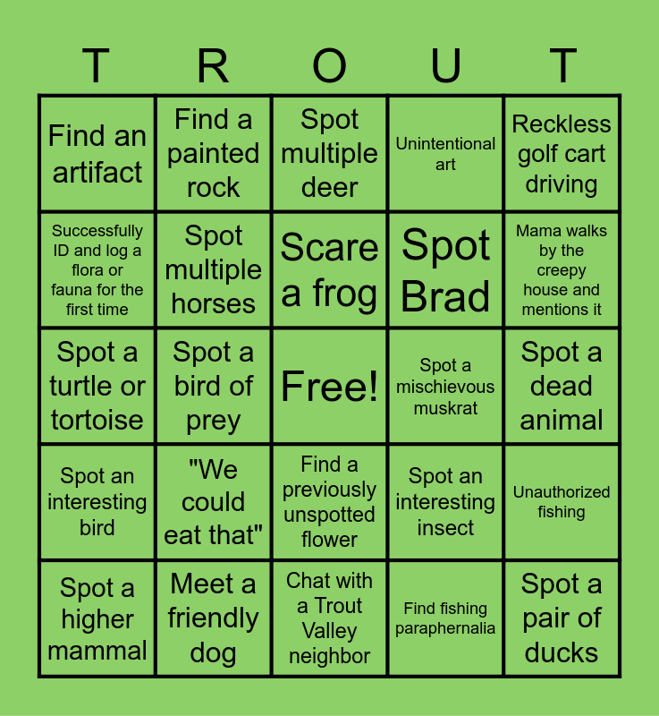 This bingo card has a free space and 30 words: Meet a friendly dog, Spot a fish, Spot a bird of prey, Pick up 5 pieces of trash, Find an artifact, Spot multiple deer, Spot multiple horses, Find a previously unspotted flower, Spot a mischievous muskrat, Chat with a Trout Valley neighbor, Spot a dead animal, Spot a pair of ducks, Find fishing paraphernalia, Find a stick taller than you, Mama walks by the creepy house and mentions it, Find a good book in the lending library you didn't add, Spot an interesting insect, Spot an interesting bird, "We could eat that", Reckless golf cart driving, Spot a turtle or tortoise, Find a fun fungus, Find a painted rock, Spot Brad, Successfully ID and log a flora or fauna for the first time, Unintentional art, Unauthorized fishing, Spot a higher mammal, Scare a frog and Evidence of a meal.